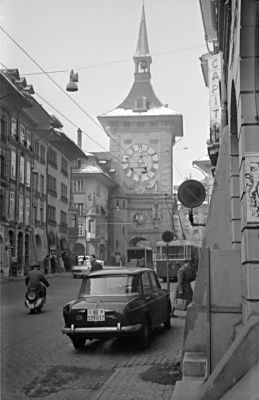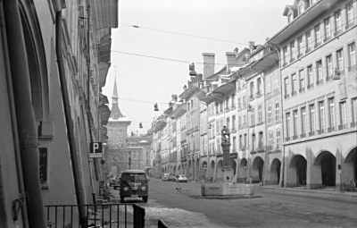 Hier eine typische Berner Straße mit Kolonnaden, einem der vielen Brunnen und dem berühmten Zeitglockenturm (s. Auch oben) im Hintergrund. |