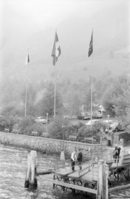 Besonders eindrucksvoll: ein Trip per Bahn zum Vierwaldstädter See. Hier eine Anlegestelle mit den Fahnen von Schwyz, Uri und Unterwalden,,, |